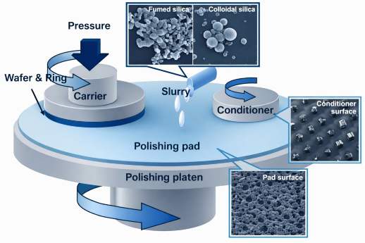 Жартылай өткізгіштер өндірісіндеХимиялық механикалық планаризация (CMP)процесс келесі литография қадамдарының сәтті немесе сәтсіздігін тікелей анықтай отырып, пластинаның бетінің планаризациясына қол жеткізудің негізгі кезеңі болып табылады. CMP-дегі маңызды шығын материалы ретінде жылтырату суспензиясының өнімділігі Жою жылдамдығын (RR) бақылаудың, ақауларды азайтудың және жалпы өнімділікті арттырудың соңғы факторы болып табылады.