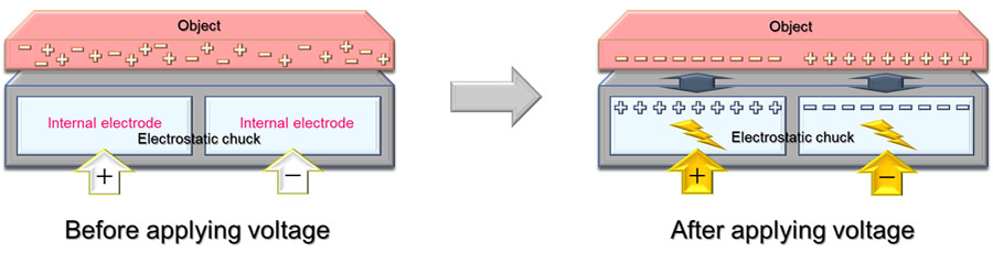 Электростатикалық Чак (ESC) - бұл электростатикалық күшті пайдалану үшін, оларды ұстап, басып, заттарды (дайындамаларды) пайдаланады. Кез-келген материал көзге көрінбейтін оң және теріс зарядтарды жүзеге асырады. Егер esc және биполярлы кернеу қосылған кезде, ESC ішкі электродтарына қолданылады, оң және теріс зарядтар ESC ішкі электродтарының полярлығын сәйкестендіру үшін оң және теріс зарядтарға ауысады. ESC және материал арасындағы бұл тартымдылық электростатикалық күш деп аталады және сонымен қатар біздің Чактардың негізгі қағидасы болып табылады.