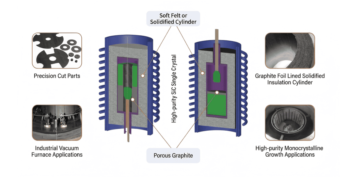 Жартылай өткізгіш өндірісі:Бұл монокристалды кремний және SiC кристалды өсіретін пеш қондырғылары үшін негізгі оқшаулау қабаты.
